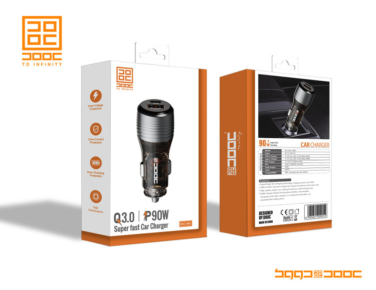 شارژر فندکی DOOC DCC-590 با توان خروجی کل ۹۰ وات طراحی شده تا همزمان چندین دستگاه را با سرعت بالا شارژ کند. این شارژر از ورودی ۱۲ تا ۲۴ ولت DC پشتیبانی میکند و برای استفاده در خودروهای سواری، کامیونها و سایر وسایل نقلیه مناسب است.